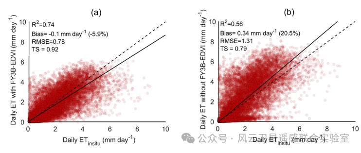 图2:考虑(a)和不考虑(b)微波EDVI所反演的逐日ET的精度比较。