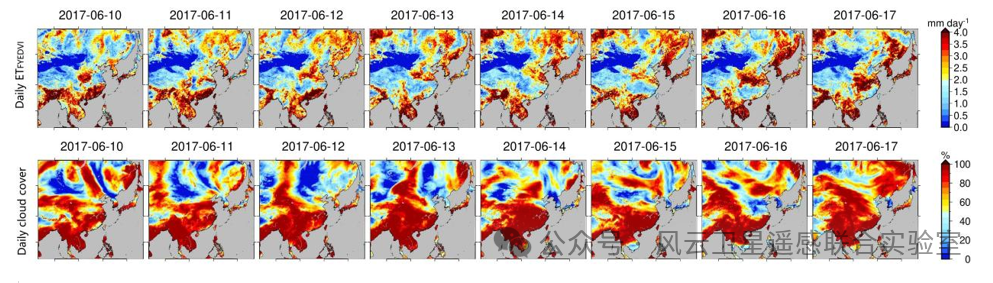 图3:东亚地区全天空ETFYEDVI(第一行)和云量(第二行)的逐日变化时空格局。图中展示的是2017年6月10日至17日连续8天的结果。该时期内每天都有超过 85% 的陆面区域被云覆盖。
