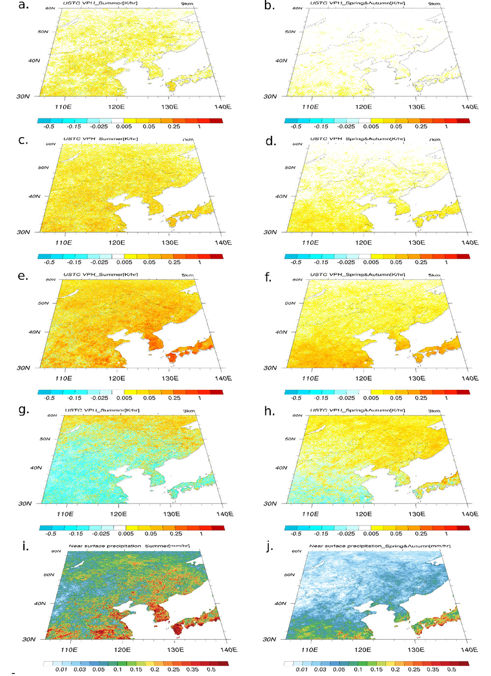 图1:夏季(左)与春秋季(右)在3,5,7,9公里高度的潜热水平分布对比。 夏季,尤其是在朝鲜半岛和中国东北沿海地区,受海洋水汽影响,潜热加热明显更强,范围更广。