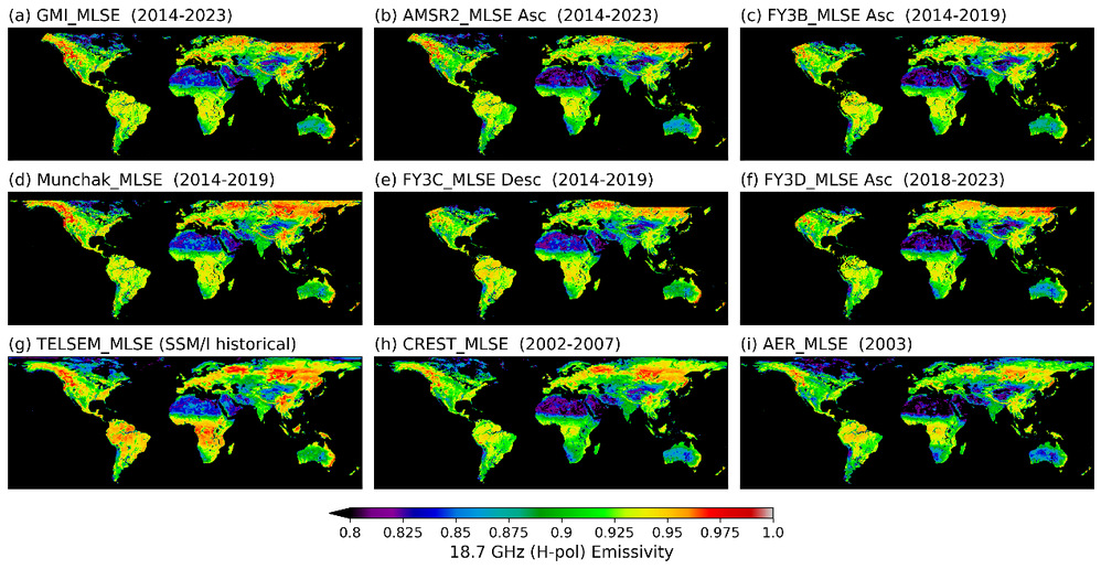 针对上述瓶颈,中国科学技术大学和中国气象局通过局校合作,由风云卫星遥感联合实验室李锐教授团队联合中国气象局气象探测中心、国家卫星气象中心、国家地球系统模拟和数值预报中心、中国科学院空天信息创新研究院等多家单位研究人员,成功将中国三颗风云三号卫星(FY-3B/C/D)微波辐射计MWRI与国际主流微波探测任务 GPM/GMI 和 AMSR2融合,研发出全球高一致性、完整覆盖、多星联合微波地表发射率(Microwave Land Surface Emissivity, MLSE)反演算法及产品,为全球陆面过程研究、陆气相互作用模拟以及降水反演等业务与科研应用提供了更高精度、更高稳定性的基础数据。相关成果以“Global retrieval of harmonized microwave land surface emissivity leveraging multi-sensor measurements from GMI, AMSR2 and MWRIs” 为题发表在国际遥感领域的顶级期刊《Remote Sensing of Environment》上。
