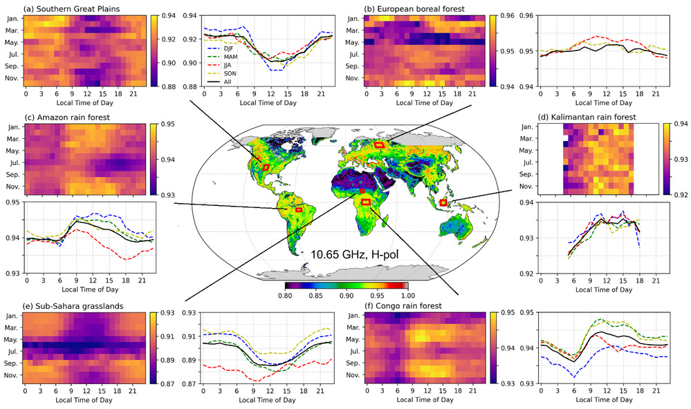 评估显示,该融合数据集在全球尺度表现出极高的一致性(图2):不同传感器之间的相关性普遍超过 0.95,均方根误差控制在 1%以内,系统偏差小于0.5%。与地面观测和多套国际主流单一卫星发射率产品对比也表现出优异的一致性,均方根误差普遍优于 1.5%,进一步验证了融合反演体系的可靠性与稳健性。该产品在全球森林、草地、农田等典型生态系统中展现出与植被覆盖、降水与土壤湿度,季节性变化分析中表现优良,显示出在陆面水文、生态监测、地球系统模式及长期气候研究中的广阔应用前景(图3)。