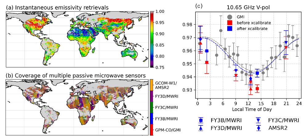 图1,(a)多星地表发射率瞬时反演,(b)多星联合全球地表覆盖范围,(c)融合五颗卫星微波观测构建的地表发射率日变化曲线