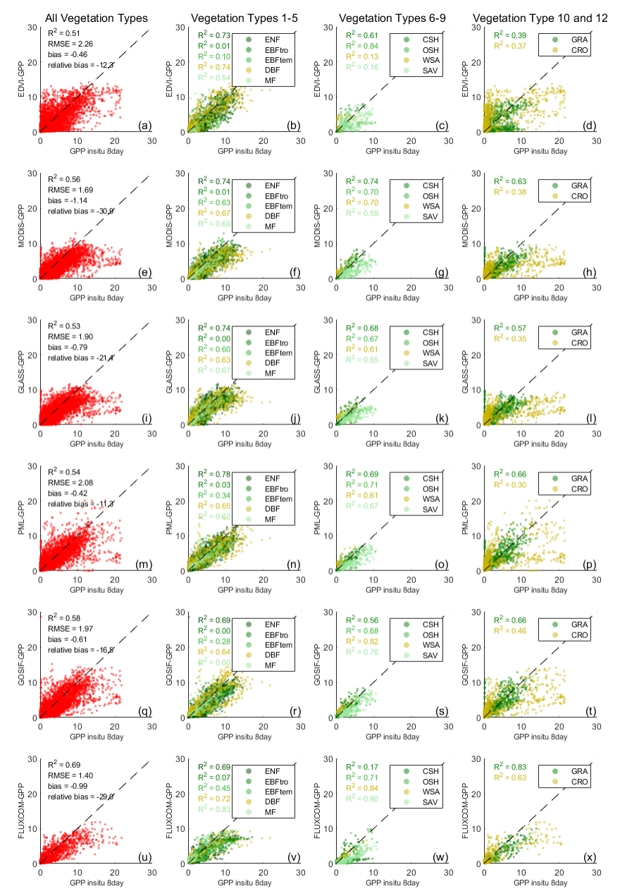 图1 8天平均的(a-d)2020-2022年EDVI-GPP、(e-h)2020-2022年的MODIS-GPP、(i-l)2020-2022年的GLASS-GPP、(m-p)2020-2022年的PML-GPP,(q-t)2020-2022年的GOSIF-GPP、(u-x)仅2020年的FLUXCOM-GPP数据,与所有植被类型(第一列)、森林(第二列)、灌木丛与稀树草原(第三列)、草地与农田(最后一列)的站点GPP观测值的散点图。