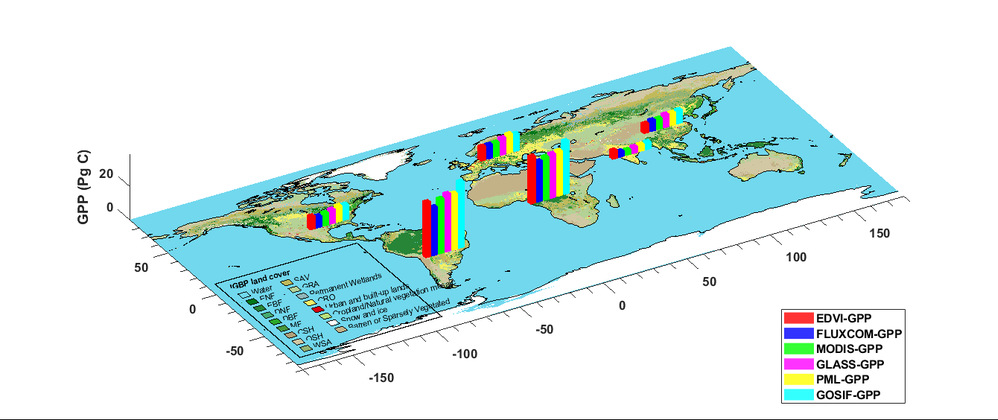 图3 2020年全球不同经济体及主要区域(包括美国、中国、印度、欧洲、非洲和南美洲)的EDVI-GPP、FLUXCOM-GPP、MODIS-GPP、GLASS-GPP、PML-GPP和GOSIF-GPP产品估算值。EDVI-GPP以红色柱状图表示,FLUXCOM-GPP为蓝色柱状图,MODIS-GPP为绿色柱状图,GLASS-GPP为洋红色柱状图,PML-GPP为黄色柱状图,GOSIF-GPP为青色柱状图。背景土地覆盖图源自2020年MCD12C1土地覆盖数据。