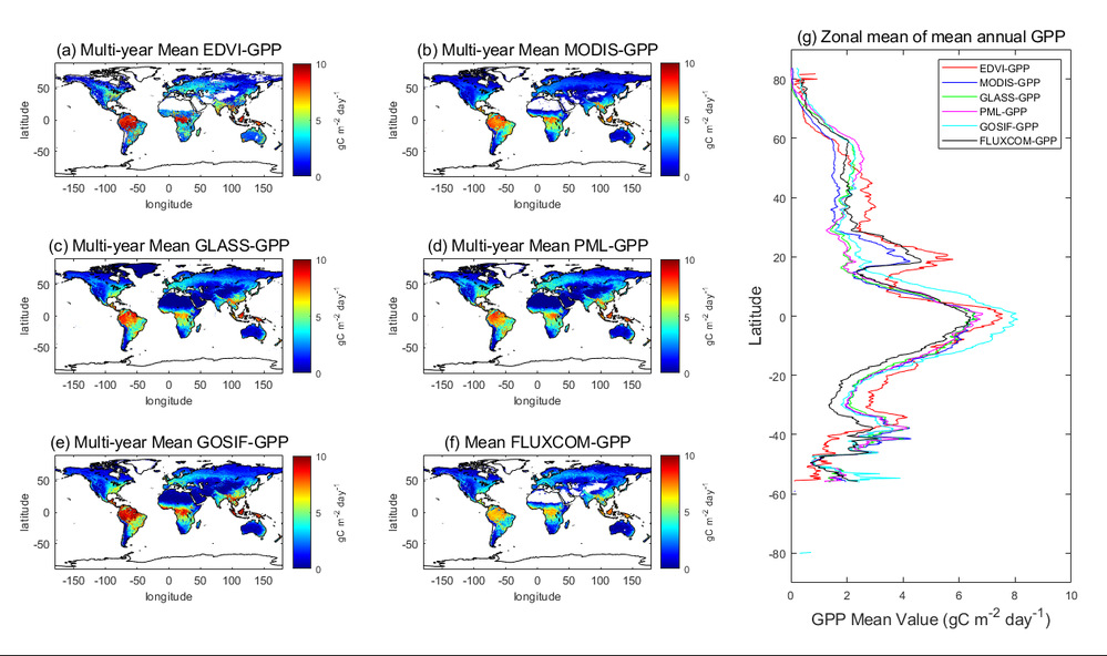 在8天尺度上,2020–2022年间EDVI-GPP与站点GPP观测值的决定系数(R2=0.51)与主流GPP产品(FLUXCOM-GPP、MODIS-GPP、GLASS-GPP、 PML-GPP及GOSIF-GPP)表现一致(图1),且有着较小的bias(-0.46 gC m-2 day-1)。