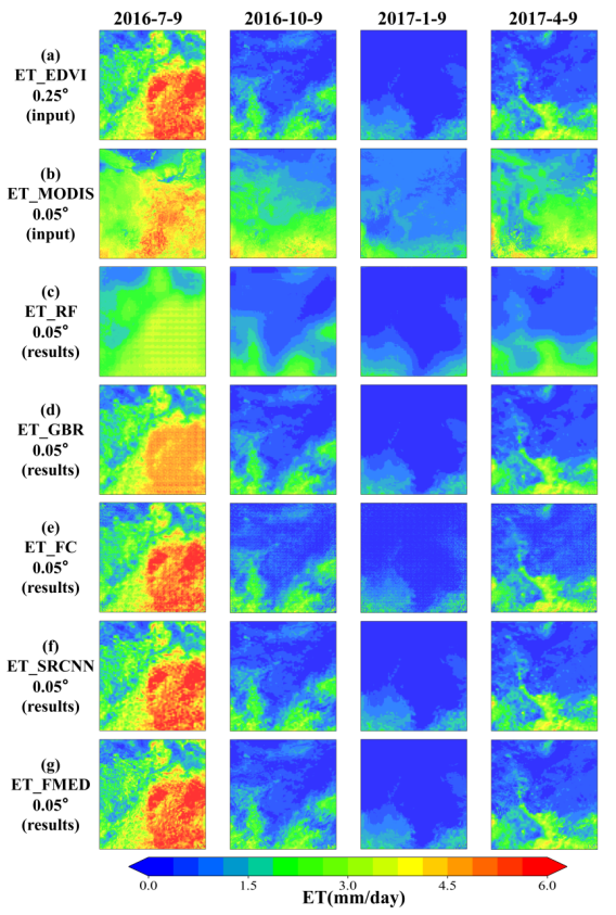 (a) 0.25° ET_EDVI;(b) 0.05° ET_MODIS;(c) 0.05° ET_RF;(d) 0.05° ET_GBR;(e) 0.05° ET_FC;(f) 0.05° ET_SRCNN;(g) 0.05° ET_FMED。其中,(a)和(b)为降尺度模型输入数据,(c)–(g)为不同降尺度方法生成的ET结果