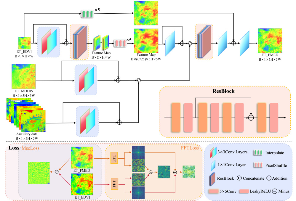 该研究将微波遥感的全天候观测优势与光学遥感的高空间分辨率优势有机结合,在超分辨率框架下融合每日0.25°微波蒸散发数据、8天0.05°光学蒸散发数据及地表覆盖、植被参数、地表温度和地形等多源辅助信息,构建了基于残差网络(ResNet)和亚像素卷积(PixelShuffle)上采样的多源融合降尺度模型(图1)。同时,研究团队引入空间域与频率域联合监督机制,通过傅里叶变换对振幅和相位信息进行约束,增强了模型对高频纹理和局部细节的恢复能力。为系统评估该方法的有效性,研究团队从多个层面开展了验证:选取随机森林(RF)、梯度提升回归(GBR)、全连接网络(FC)和超分辨率卷积神经网络(SRCNN)等代表性降尺度方法进行对比;利用10个涡动相关观测站点数据开展站点尺度验证;结合不同季节及不同云条件下的空间分布结果,检验模型在复杂情景下的适用性;并通过消融实验分析傅里叶监督机制及多源辅助信息在模型中的作用。